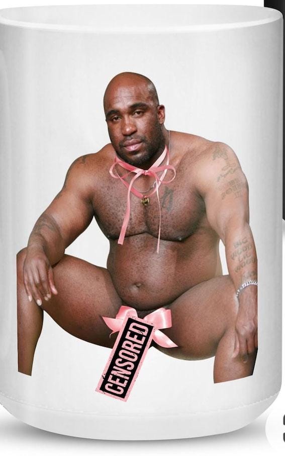 The censored version of the mug features a close-up of Barry Wood's face and body with a censored bar over the appendix